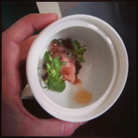 Then, I’m not sure what happened. Meghan piled it onto a spoon and somehow convinced me to try it. I chanted in my head, “I’m eating chicken. I’m eating chicken” as I chewed. The tartare was accompanied by sprouted lentils, cured rhubarb, spicy marrow and chickweed.