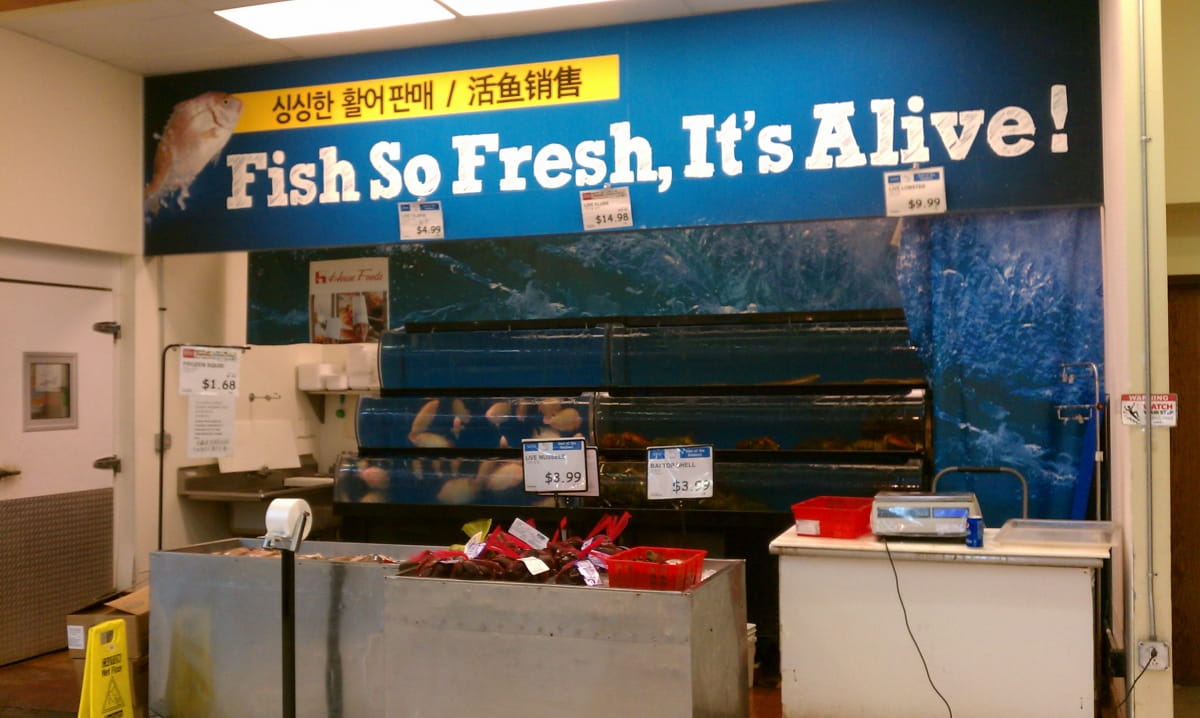 Speaking of seafood, H Mart had a wide variety of fresh seafood for sale and a funny sign to go along with it: