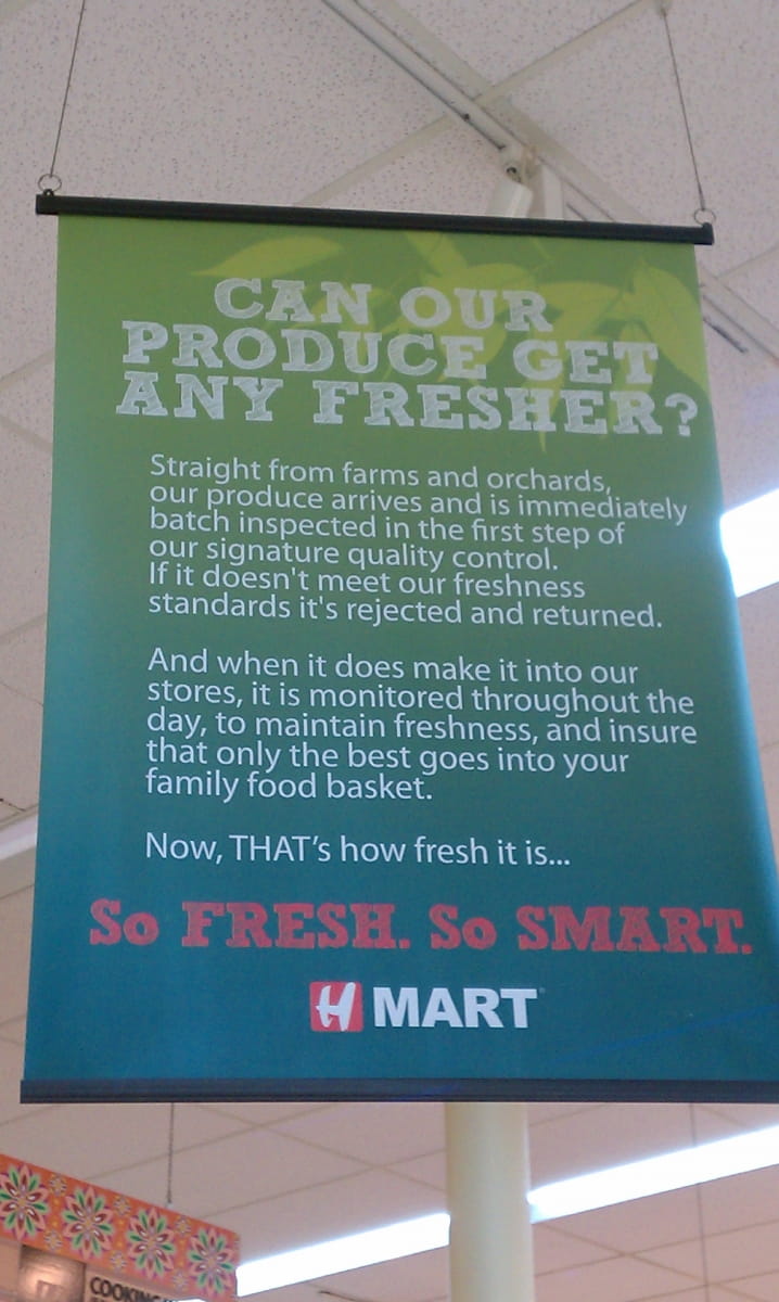 Hanging in the front of the store near the registers, this H Mart sign assures customers that freshness is top-of-mind for them, as well.