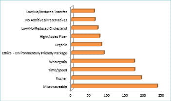 Microwavable is the top hot cereal claim in 2013 with kosher and whole grain tied for second. From 2012-2013, the whole grain claim saw a 112% increase in the hot cereal category. Organic was another claim that saw a 33% increase from 2012-2013. The largest growing claim within the hot cereal claims is GMO-Free with an 800% increase. Claims that are declining from 2012-2013 are: low/no/reduced fat, time/speed, low/no/reduced cholesterol, low/no/reduced fat and low/no/reduced sodium.