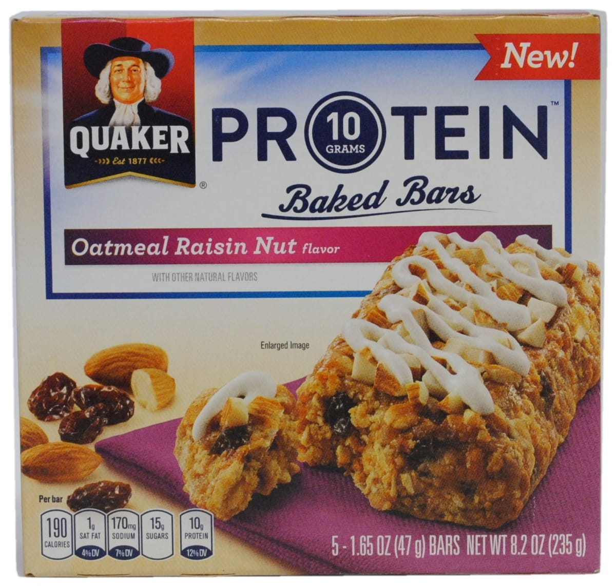Quaker Protein Oatmeal Raisin Nut Flavor Baked Bars: Described as a great recharge for the day. This product is a good source of protein containing 10g of it, as well as 8g whole grain in every bar.