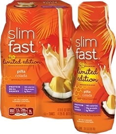 Slimfast Pina Colada Shake: Available as a limited edition. This tropical treat contains 10g protein and 5g fiber, all for under 200 calories.