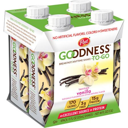 Post Goodness-To-Go Breakfast/Anytime Shake has no artificial flavors, colors or sweeteners and 15g of protein. Flavors include: Dutch Chocolate, Tahitian Vanilla and Mocha.
