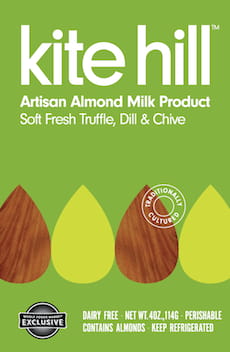 Kite Hill artisanal nut-milk based-cheeses are made using time-honored techniques of traditional artisanal dairy cheese-making. The product is made using only a short list of the best ingredients and custom blending of each batch. One flavored product is available: Soft Fresh Truffle, Dill & Chive.