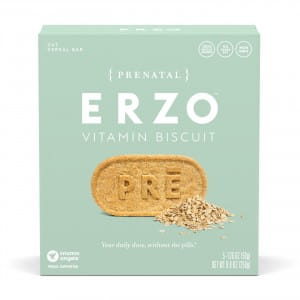 Erzo is a Prenatal Vitamin cookie with no artificial sweeteners, 0g trans-fats, 100% whole grains and non-gmo. It was created to reinvent the way you take vitamins by putting your complete daily dose of prenatals into 3 yummy biscuits. They are available in 4 flavors—oat, apple cinnamon, strawberry Greek yogurt and ginger.