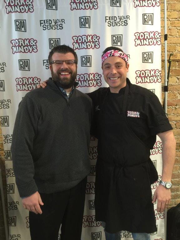 4. Sweet!—If you eat at Food Network star Jeff Mauro’s new Chicago restaurant Pork & Mindy’s, you’ll likely encounter bacon (and MANY other delicious things like the tots and homemade buttermilk ranch). To make the menu staple “pig candy,” the chefs caramelize the bacon, then stuff it into BLTs, crumble it on salads and sprinkle on sundaes. P.S. See the pic below of our very own Josh Lanagan & Chef Mauro.