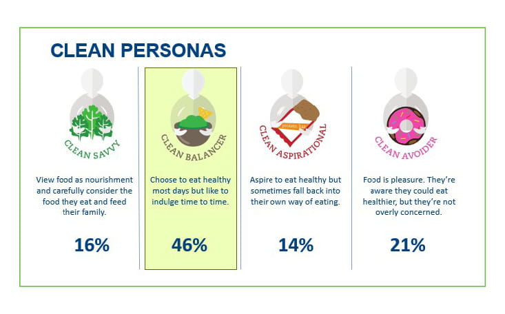 Most recently, we’re sharing some in-depth research into one of those personas – the Clean Balancer. Nearly half (46%) of all consumers in fact self-identify as Clean Balancers. It’s a group that eats healthy whenever possible with room for occasional indulgence. They gravitate towards kitchen-friendly ingredient lists, equate clean label with “health,” and are accepting of natural and organic flavors in the products they buy.