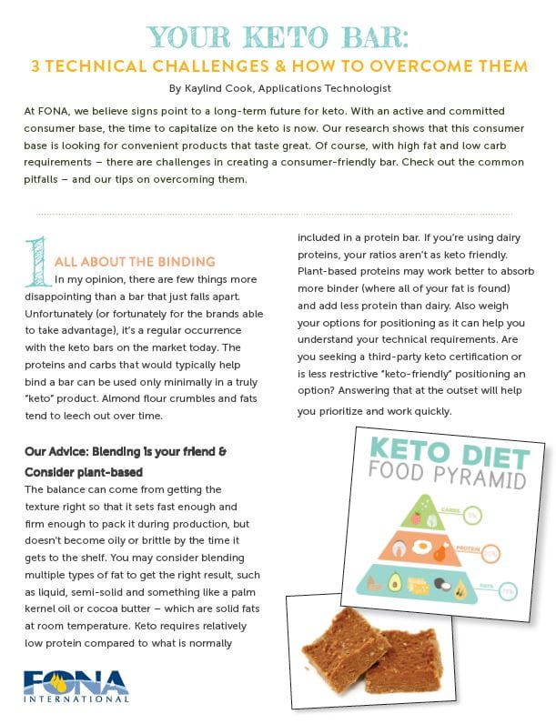 Our research shows that the keto consumer base is looking for convenient products that taste great. Of course, with high fat and low carb requirements – there are challenges in creating a consumer-friendly bar. In this piece, Applications Technologist Kaylind Cook shares advice from the team at FONA. From the effect of blended fats to balancing sweetness, let's dig into three common challenges in keto bar development — and how you can rise above them.