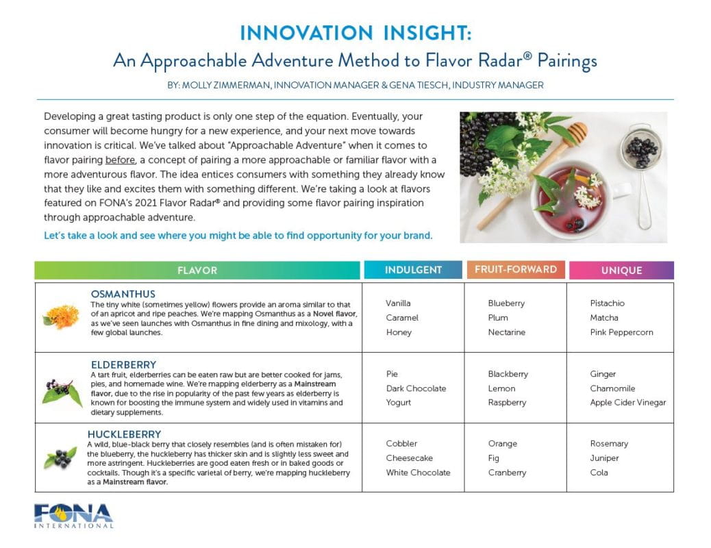 Knowing when and how to innovate next can be a challenging feat. And when your consumer becomes hungry for a new experience, your next move towards innovation can be crucial to your brand's success. We’ve talked about “Approachable Adventure” when it comes to flavor pairing before, a concept of pairing a more approachable or familiar flavor with a more adventurous flavor. The idea entices consumers with something they already know that they like and excites them with something different. We’re taking a look at flavors featured on FONA’s 2021 Flavor Radar® and providing some flavor pairing inspiration through approachable adventure. Let’s take a look and see where you might be able to find opportunity for your brand.