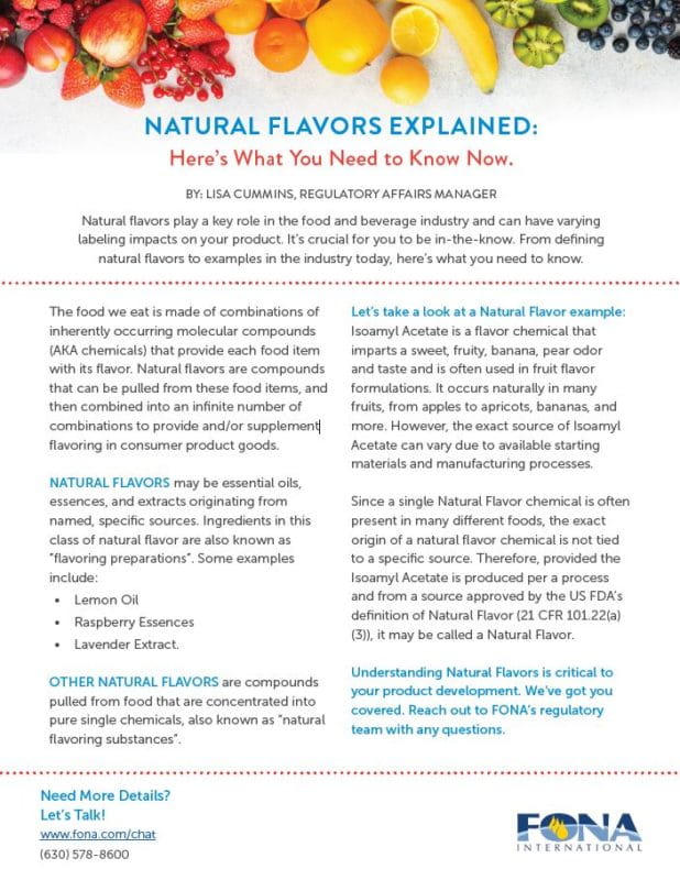 July 22, 2021Natural flavors play a key role in the food and beverage industry and can have varying labeling impacts on your product. It’s crucial for you to be in-the-know. From defining natural flavors to examples in the industry today, FONA's own, Regulatory Affairs Manager Lisa Cummins is diving into the key takeaways you need to know now. See the tip sheet below for more.