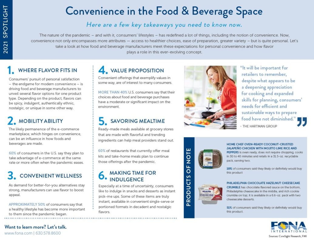 The nature of the pandemic – and with it, consumers’ lifestyles – has redefined a lot of things, including the notion of convenience. Now, convenience not only encompasses more attributes — access to healthier choices, ease of preparation, greater variety – but is quite personal. Let’s take a look at how food and beverage manufacturers meet these expectations for personal convenience and how flavor plays a role in this ever-evolving concept. Learn more in our 2021 Spotlight on Convenience in the Food & Beverage Space.